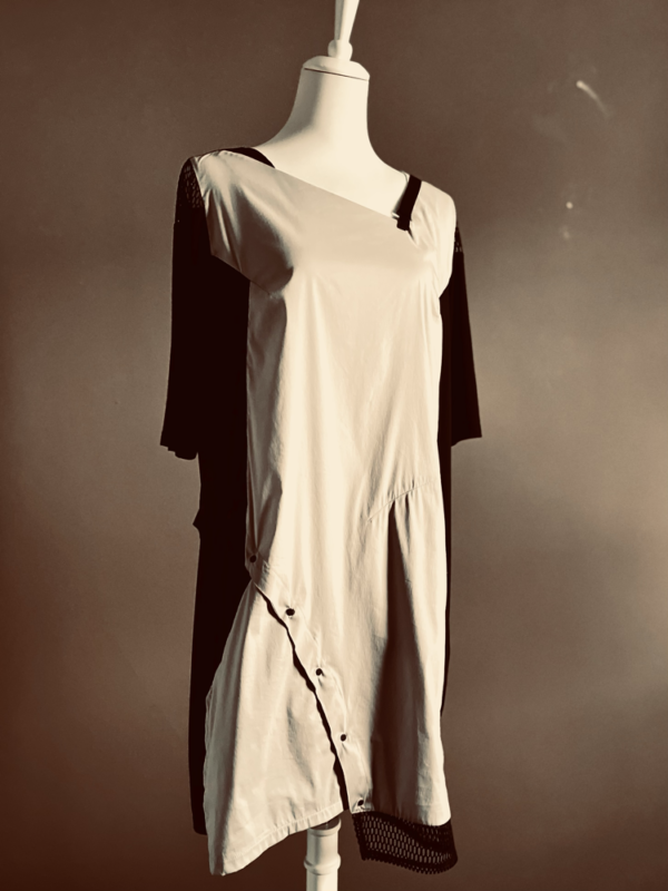 Ein besonderes Highlight ist das abknöpfbare Element, das es ermöglicht, einen Teil des Kleides zu entfernen und den Look individuell zu verändern – wandelbar, experimentell und einzigartig. Die Farbgestaltung unterstreicht den spannenden Charakter des Designs: Vorne in hellem Grau, wirkt das Kleid klar und reduziert, während die schwarze Rückseite einen markanten Kontrast setzt und dem Modell zusätzliche Ausdruckskraft verleiht.