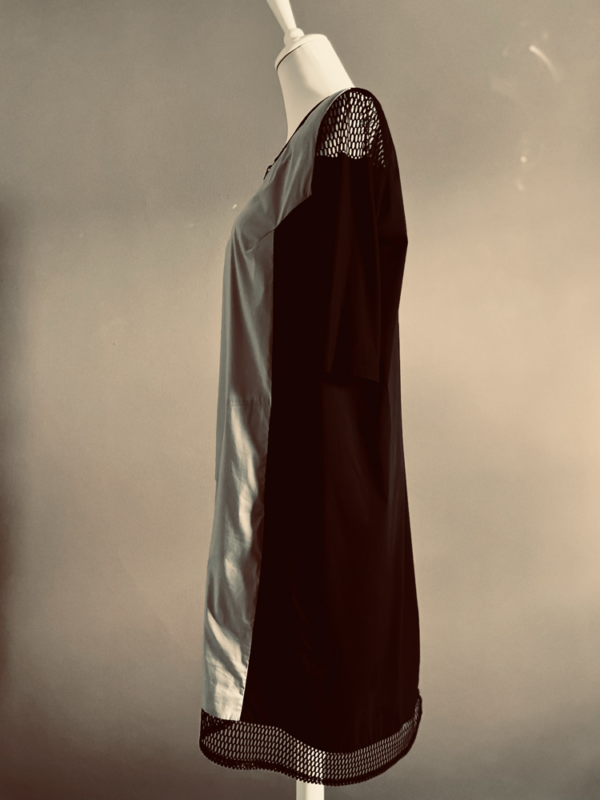 Dieses ausgefallene asymmetrische Kleid von Art Point steht für avantgardistisches Design und kreative Wandelbarkeit. Der raffinierte Materialmix verleiht dem Kleid Tiefe und Struktur, während Netzeinsätze an den Schultern und am Saum für Transparenz und eine moderne, fast grafische Leichtigkeit sorgen.