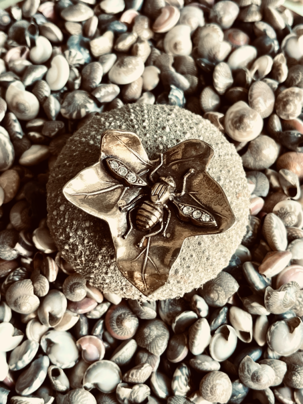 Auf dem Blatt sitzt eine kleine, kunstvoll gearbeitete Biene – ebenfalls in goldfarbenem Metall gehalten. Ihre Flügel sind mit feinen Strasssteinen besetzt, die bei Lichteinfall dezent funkeln und dem Anhänger eine edle, verspielte Note verleihen.