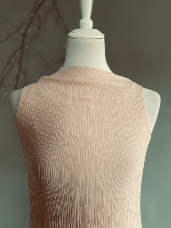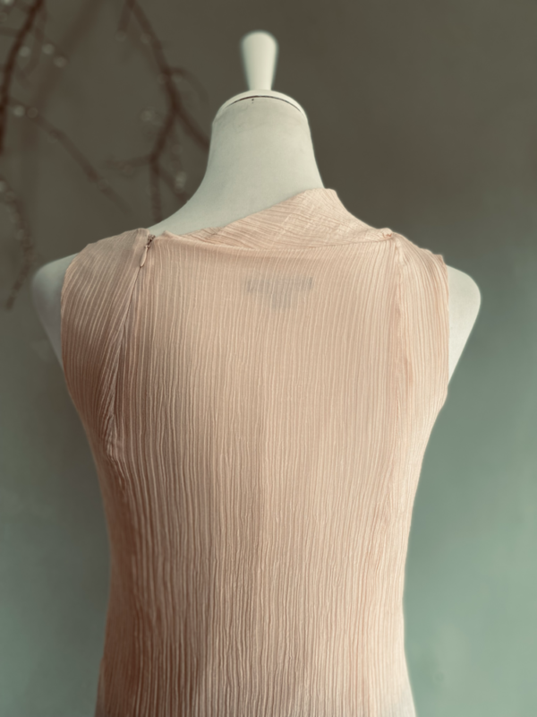 Der leicht asymmetrische Ausschnitt verleiht dem klaren Schnitt eine subtile Spannung, während der asymmetrisch verlaufende Reißverschluss am Rücken ein überraschendes Designelement setzt. Gefertigt aus edler Seide und doppellagig gearbeitet, fällt das Material fließend und wirkt zugleich strukturiert und leicht.