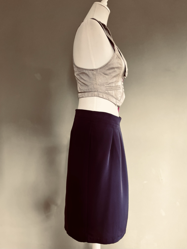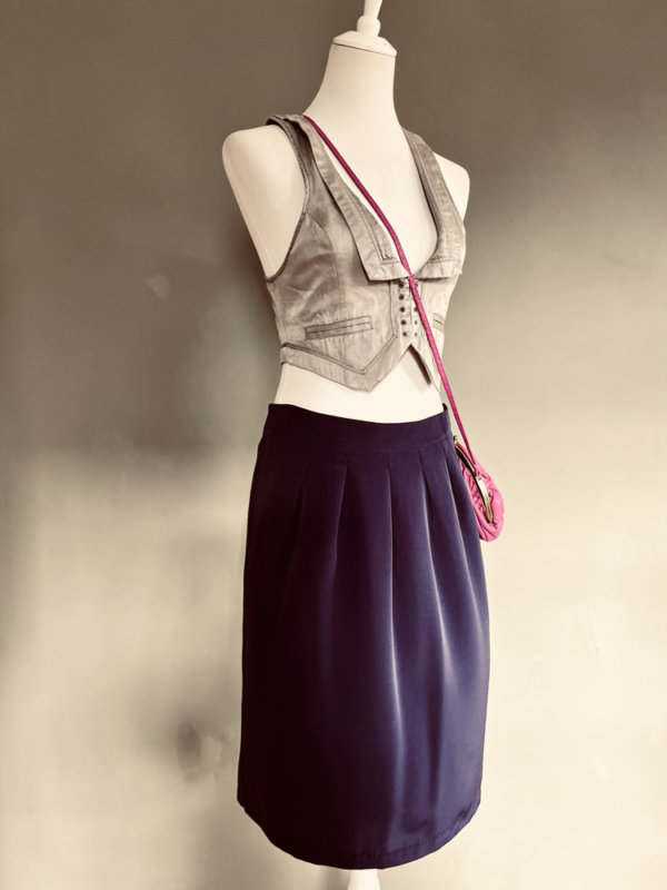 Vorne sorgt ein schöner Faltenwurf für eine fließende, schmeichelhafte Silhouette, während das leichte, seidige Material dem Rock eine anmutige Bewegung verleiht. Für zusätzlichen Tragekomfort ist ein Unterrock eingenäht, der das angenehme Tragegefühl unterstreicht und die Form bewahrt.
