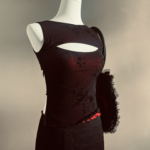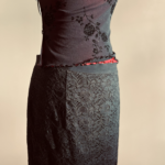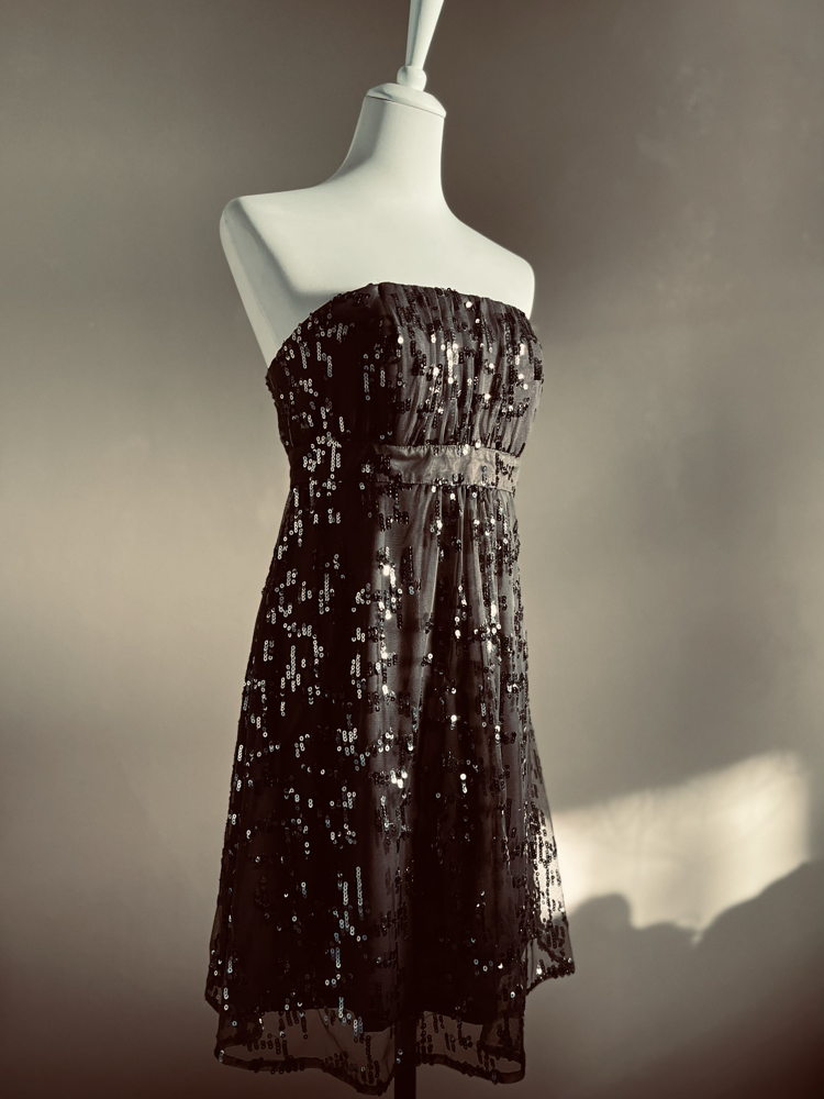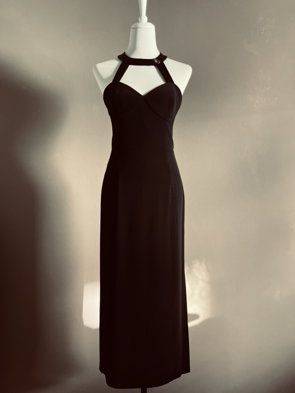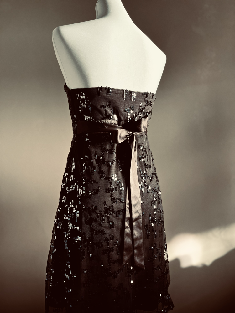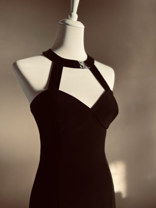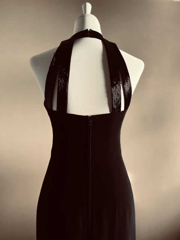 Dieses elegante Designer-Abendkleid besticht durch seine figurbetonte Silhouette und den hohen, einseitigen Schlitz, der für einen glamourösen Auftritt sorgt. Die auffälligen, überkreuzten Träger, verziert mit schwarzen Pailletten, setzen funkelnde Highlights und verleihen dem Kleid eine exklusive Note.