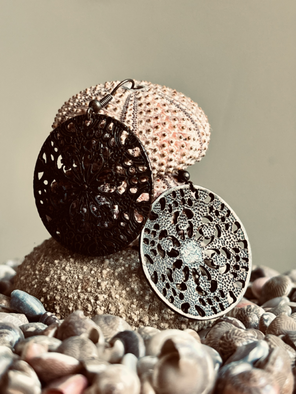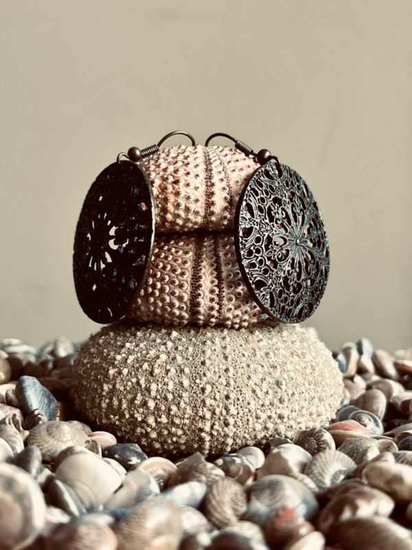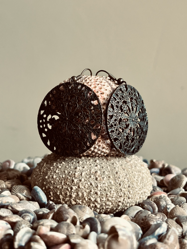 Diese hübschen, großen runden Ohrringe aus bronzefarbenem Metall bestechen durch ihr kunstvolles, filigranes Netz aus zarten Blumenranken. Das detailreiche Design verleiht den Ohrringen eine romantische, fast nostalgische Anmutung und macht sie zu einem besonderen Statement-Schmuckstück.