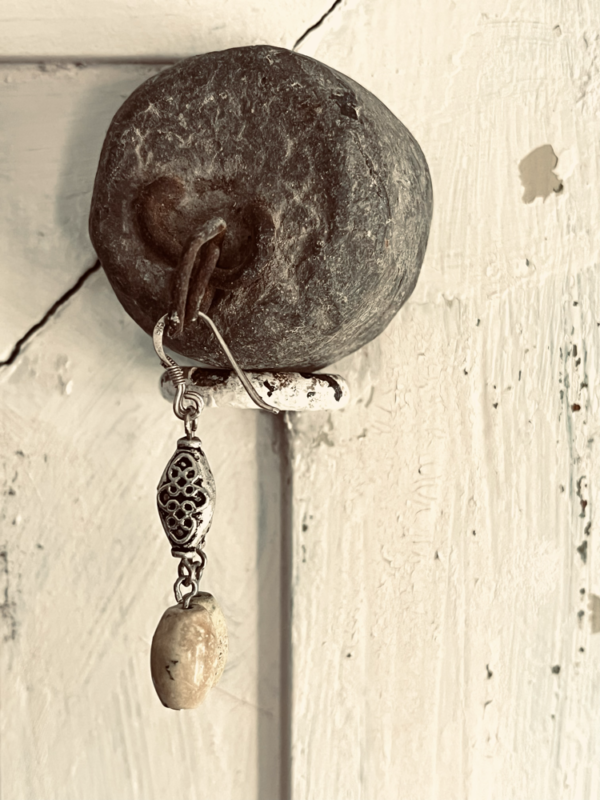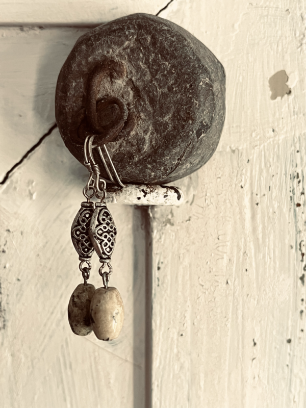 Abgerundet wird das Design durch eine fein gemusterte silberfarbene Perle, die dem Ohrschmuck eine besondere Tiefe und handwerkliche Note verleiht. Das Zusammenspiel von glänzendem Metall und natürlichem Stein macht diese Ohrringe zu einem stilvollen, aber dennoch unaufdringlichen Accessoire.