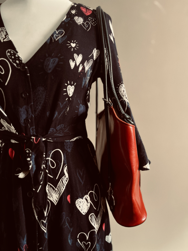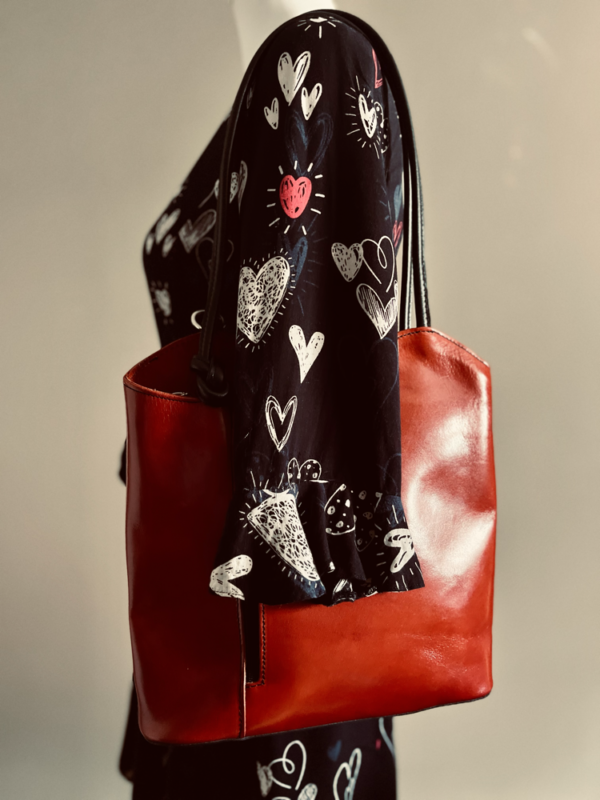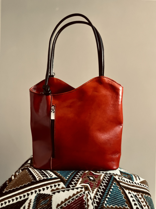 Diese hübsche Tasche aus festem, glänzendem Leder besticht durch ihr intensives Rot und den markanten schwarzen Schulterriemen, der einen eleganten Kontrast setzt. Zwei außenliegende Reißverschlüsse auf beiden Seiten verleihen ihr nicht nur eine moderne Optik, sondern auch praktische Funktionalität.