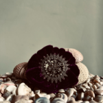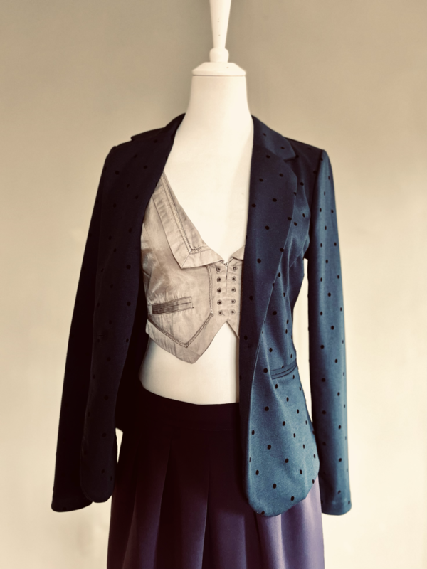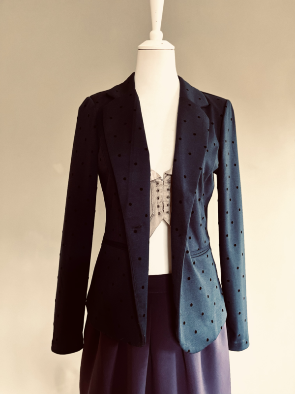 Das tief dunkelblaue Grunddesign wird durch schwarze Samtpunkte elegant aufgelockert und verleiht dem Blazer eine besondere Struktur und Tiefe. Zwei seitliche Taschen vorn und ein einzelner Knopfverschluss runden das Design funktional und modisch ab.
