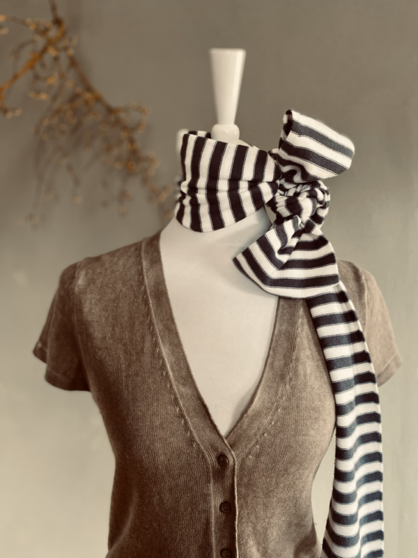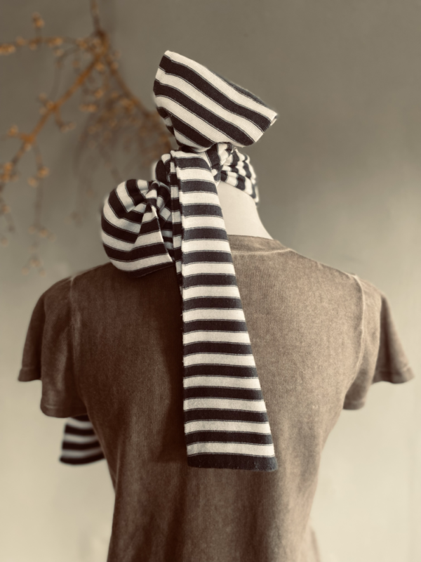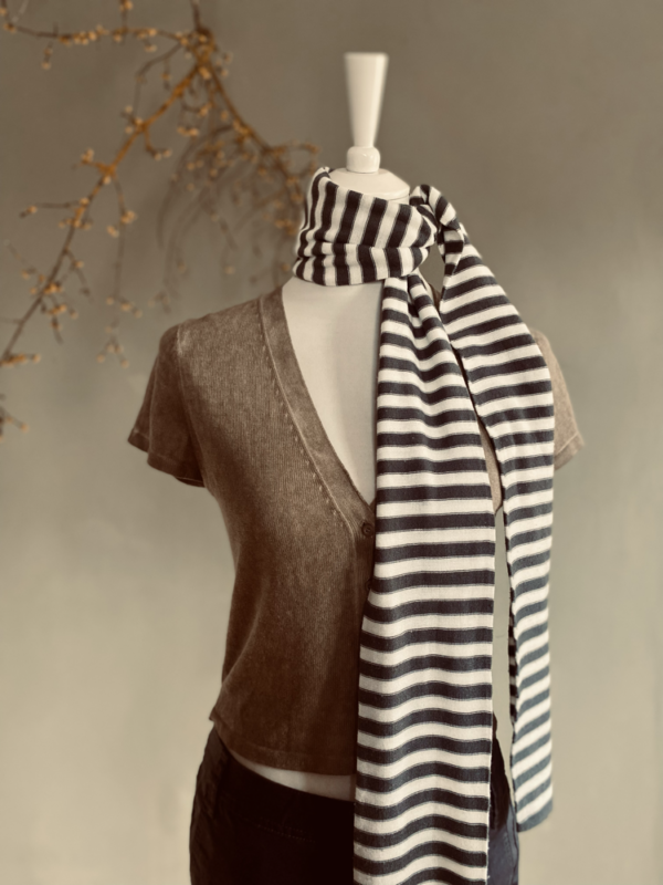 Dieser grau-weiß gestreifte, schmale Schal ist ein zeitloses Accessoire, das sich mühelos in jede Garderobe integriert. Die sanften Streifen in Grau und Weiß verleihen dem Schal eine lässige Eleganz. Das weiche Material sorgt für ein angenehmes Tragegefühl und ist angenehm auf der Haut – ideal für kühlere Tage, an denen man sich nach einem Hauch von Wärme sehnt, ohne auf Stil zu verzichten.