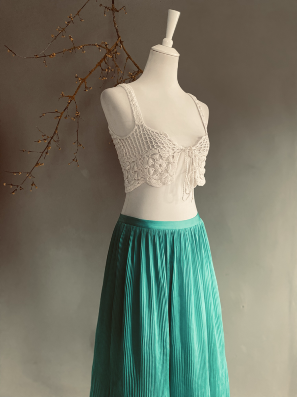 Ein kurzer Unterrock sorgt für den nötigen Komfort und schützt, während der Reißverschluss hinten den Rock sicher und bequem schließt. Der weite Schnitt gibt dem Kleidungsstück eine luftige Leichtigkeit, die ihn ideal für warme Tage oder besondere Anlässe macht.