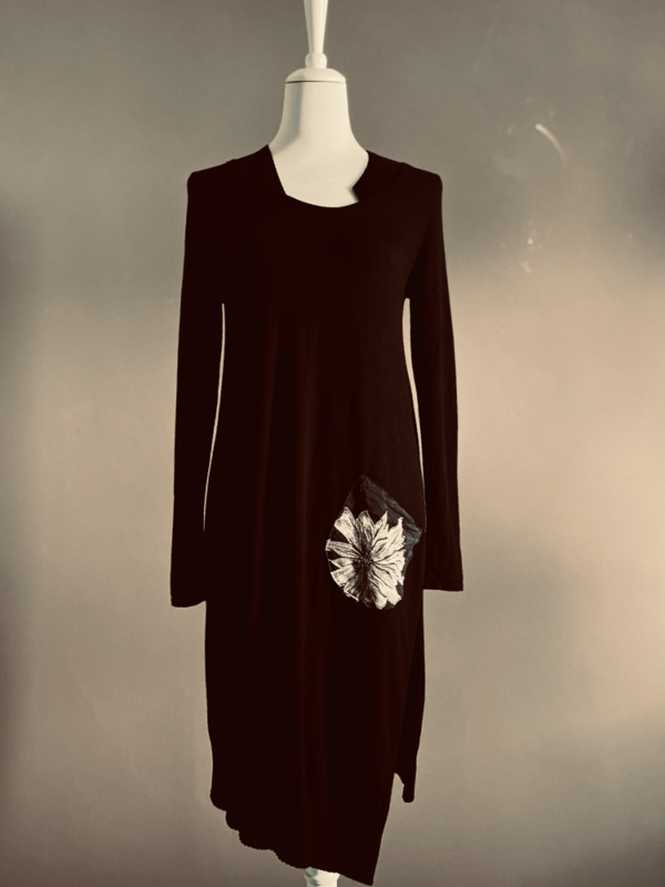 Der asymmetrische Schnitt verleiht dem Kleid eine avantgardistische Note und setzt einen spannenden Kontrast zur klaren, dunklen Silhouette. Auf der Vorderseite befindet sich eine kleine, dezent integrierte Tasche, die das Design subtil auflockert. Ein besonderer Blickfang ist der großflächige weiße Blumendruck, der sich kraftvoll vom schwarzen Stoff abhebt und dem Kleid eine künstlerische, fast poetische Ausstrahlung verleiht.