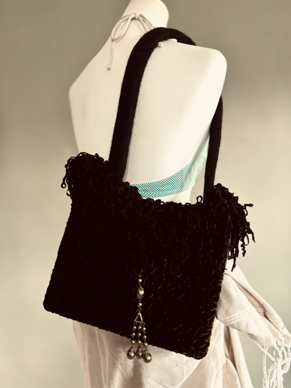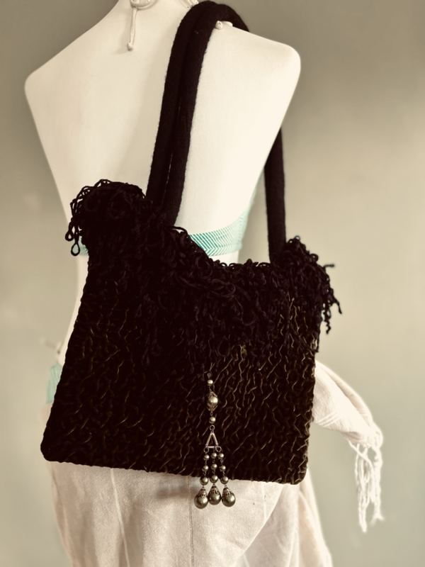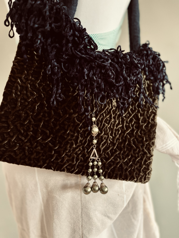 Verspielt und detailverliebt zeigt sich der stilvolle Anhänger aus feinen Perlen und flauschigen Samtbändern – ein liebevoll gestalteter Blickfang, der der Tasche ihre ganz eigene Handschrift gibt. Die Träger aus Stoff liegen angenehm auf der Schulter, während das leuchtend grüne Satininnenfutter für einen überraschenden Farbakzent sorgt.
