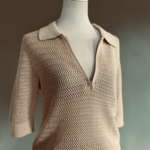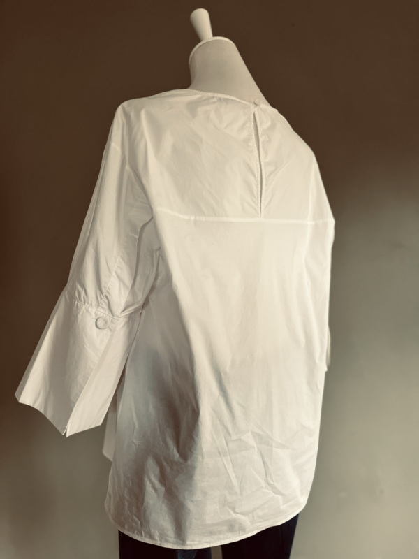 Am Rücken überrascht die Bluse mit einem eleganten Knopfverschluss am Ausschnitt – ein raffiniertes Detail, das gleichzeitig funktional und dekorativ ist.
