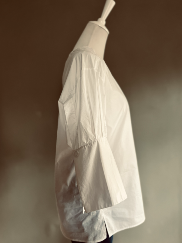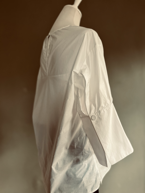 Der gerade Schnitt wird durch seitliche Schlitze aufgelockert und sorgt für angenehme Bewegungsfreiheit. Ein feiner Schlitz am Halsausschnitt bringt dezente Spannung ins Design, während die weiten Ärmel mit dem auffälligen Knopfdetail ein stilistisches Statement setzen.