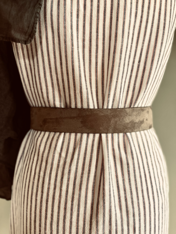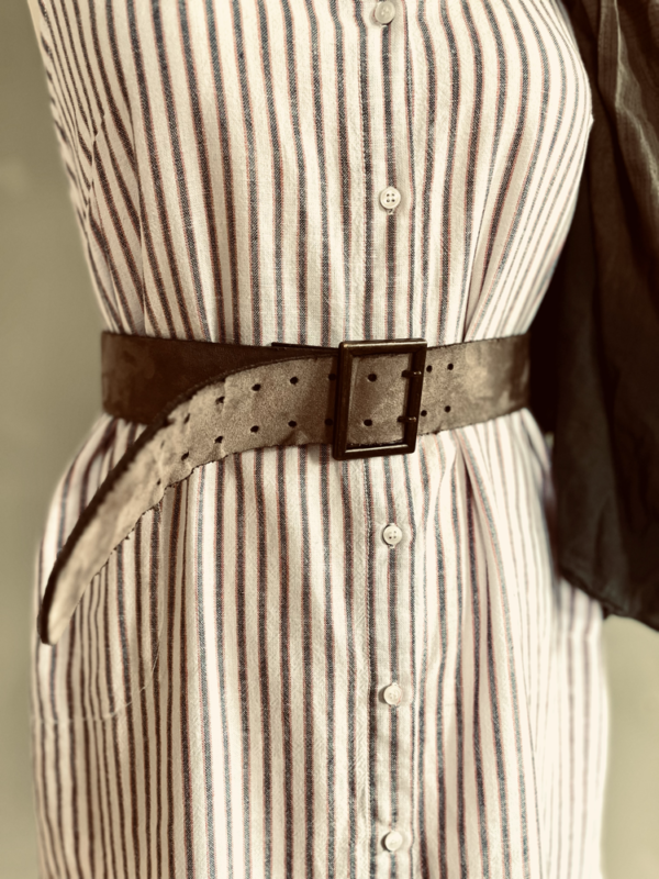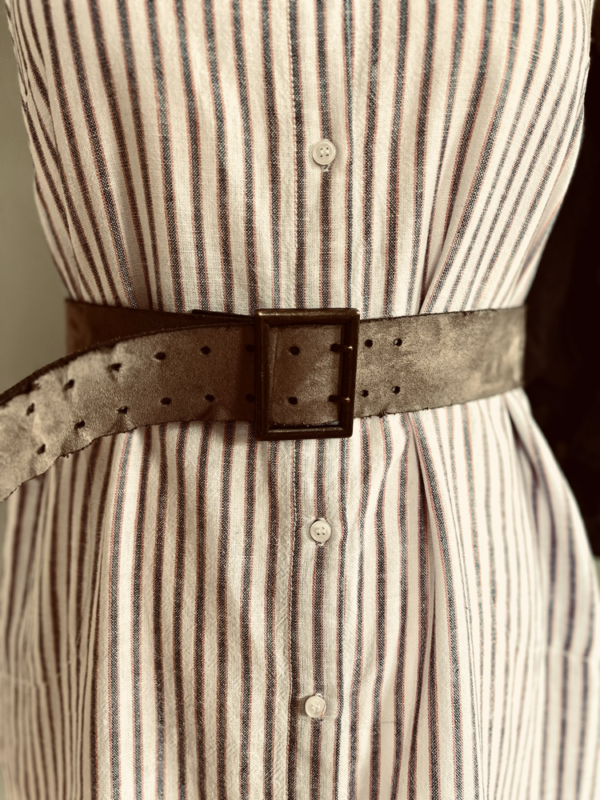 Schlichter, breiter Gürtel aus graubraunem Wildleder. Mit seiner rustikalen Optik verleiht er jedem Outfit eine natürliche und authentische Note. Die schlichte, große Schnalle setzt einen dezenten Akzent und sorgt für eine einfache, aber stilvolle Optik. Der breite Schnitt macht den Gürtel besonders vielseitig und bequem – perfekt, um lässige Looks oder auch etwas elegantere Outfits zu unterstreichen.