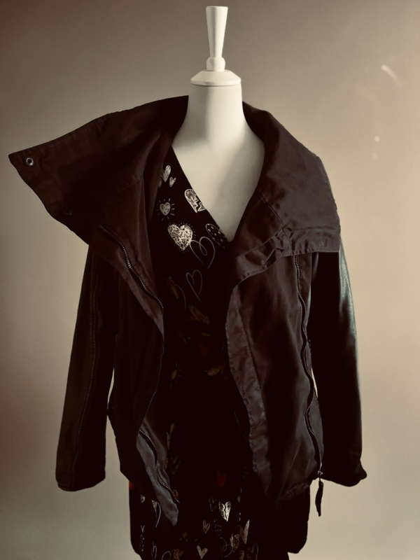Das große Revers sowie der Bereich entlang des vorderen Reißverschlusses sind aus festem Stoff gearbeitet – ein spannender Materialkontrast, der Struktur und Tiefe verleiht. Seitliche Reißverschlusstaschen und eine Innentaschebieten Funktionalität, ohne den klaren, modernen Schnitt zu stören.