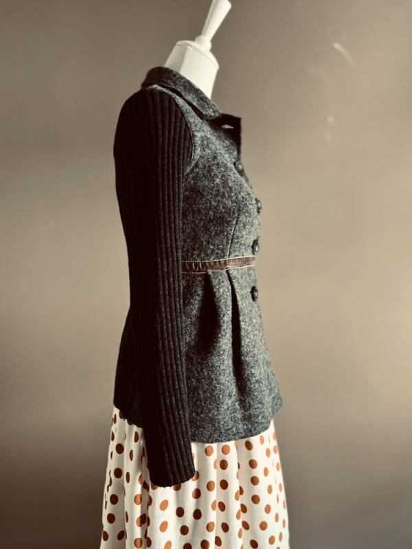Der leicht ausgestellte Schnitt der Jacke wird durch einen hübschen Faltenwurf unterstrichen, der für eine dezente Verspieltheit sorgt und das Design anmutig abrundet. Die Rückseite und die Ärmel sind im Rippstrick gehalten, was der Jacke nicht nur eine interessante texturale Tiefe gibt, sondern auch für zusätzlichen Komfort und Wärme sorgt.