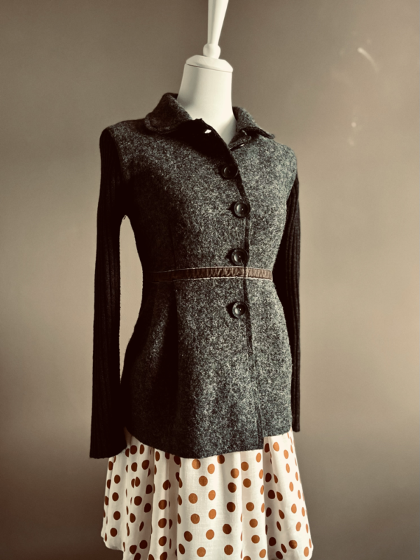 Diese romantische Jacke vereint klassische Eleganz mit einem modernen Touch. In einem warmen Grauton gehalten, besticht sie durch ihre besondere Materialkombination. Der Vorderbereich ist in Filzoptik gearbeitet, was der Jacke eine weiche, aber dennoch strukturierte Textur verleiht. Das Samtband in der Taille betont die Silhouette und sorgt für eine feminine, schmeichelhafte Form, während die Knöpfe einen zusätzlichen, charmanten Akzent setzen.