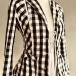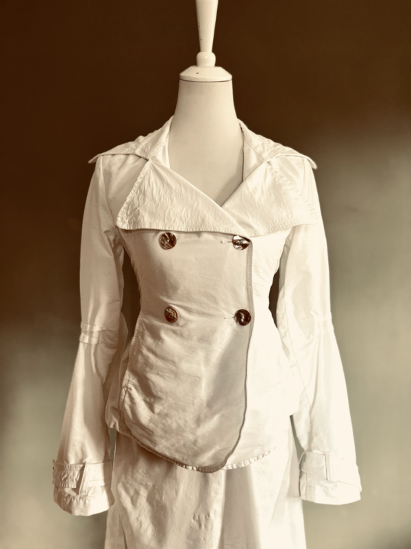 Der schmale, taillierte Schnitt betont die Silhouette und sorgt für eine figurnahe Passform. Besonders charmant: die leicht drapierten Stoffpartien an den Ellbogen, die dem Design eine subtile Bewegung und Individualität verleihen. Ein großes, weich fallendes Revers bringt klassische Eleganz ins Spiel, während die auffälligen, perlmuttglänzenden Knöpfe als stilvolle Akzente hervorstechen.