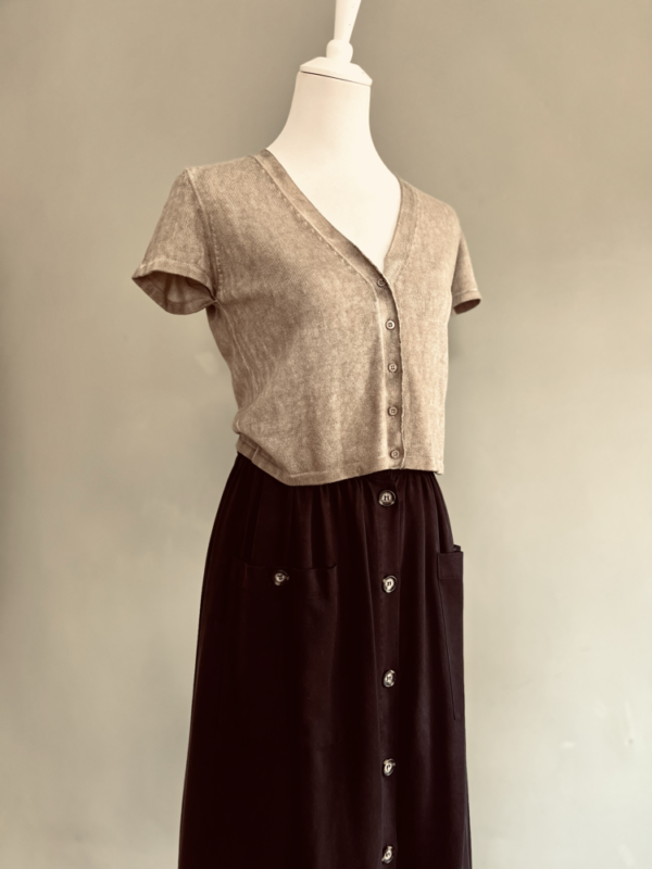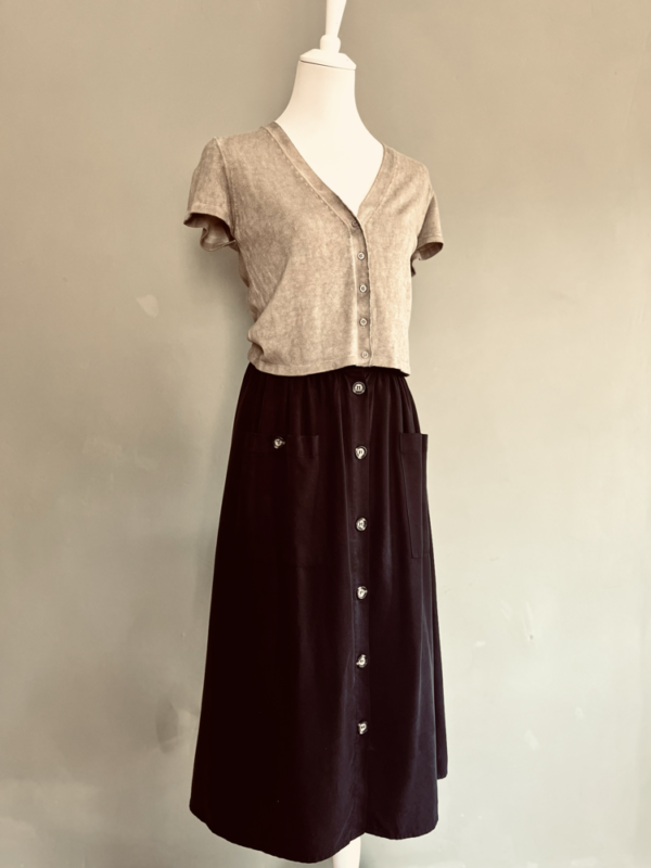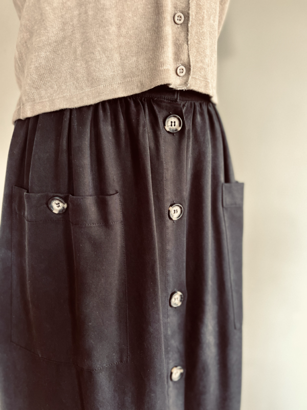 Besonders praktisch und stylisch zugleich: die zwei großen aufgesetzten Taschen und die durchgehende Knopfleiste vorne, die dem Rock eine moderne, lässige Note verleihen. Das weiche, angenehm zu tragende Material macht ihn zum perfekten Begleiter für Alltag, Büro oder Freizeit.