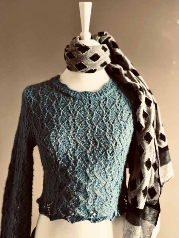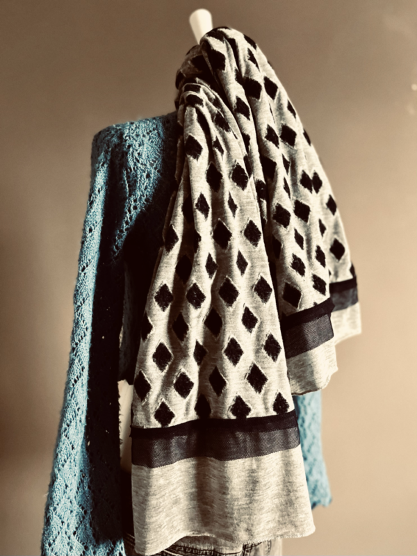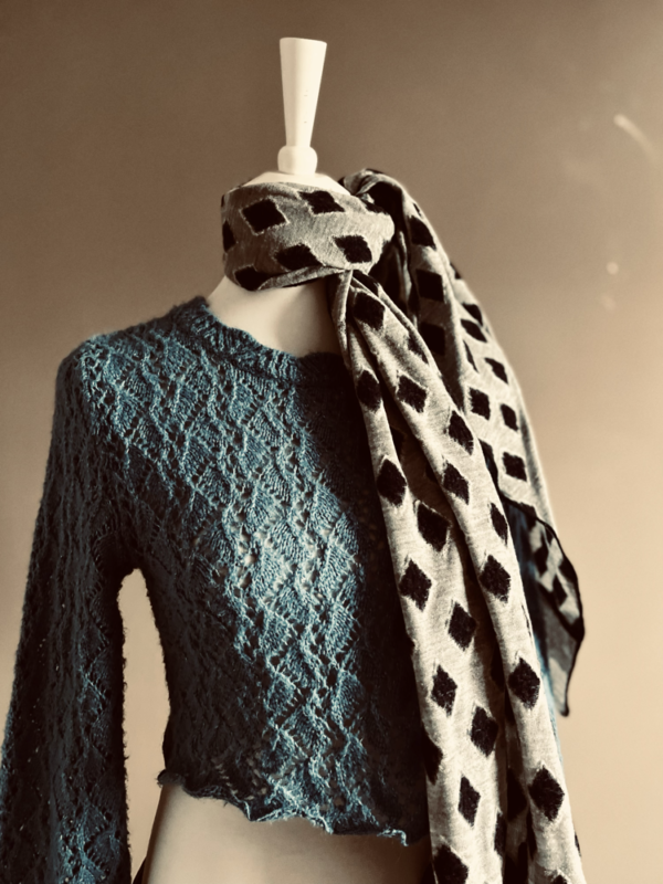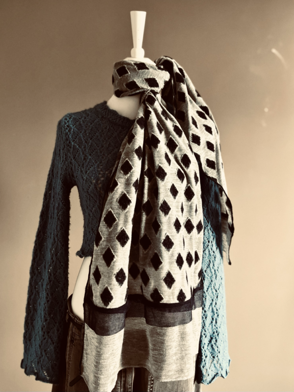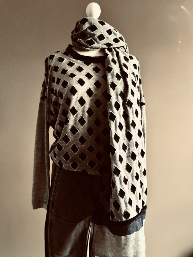 Dieser weiche, lange Schal von Beate Heymann verbindet Komfort mit ausdrucksstarkem Design. In einem zeitlosen Grauton gehalten, wird er durch ein dunkelblaues Rautenmuster aus Wolle und zarten Netzelementen stilvoll akzentuiert – ein edler Blickfang, der jedem Outfit eine besondere Note verleiht.