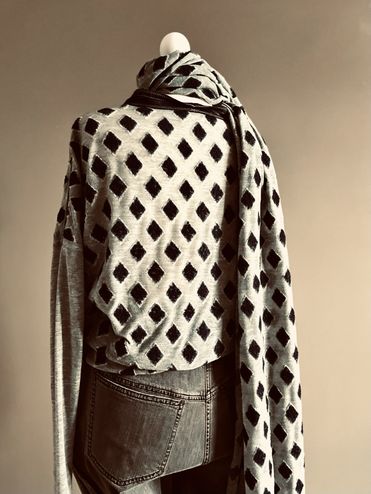 Die beiden Schalenden bestehen aus softem Jersey, der angenehm auf der Haut liegt und für ein besonders angenehmes Tragegefühl sorgt. Dank des Wollanteils bietet der Schal wohlige Wärme, ohne aufzutragen – ideal für kühle Tage oder als modisches Statement über Blazer, Mänteln oder Strick.