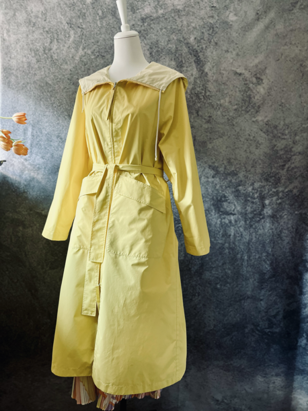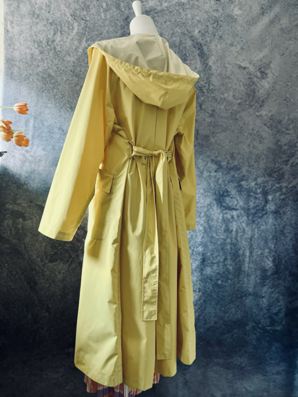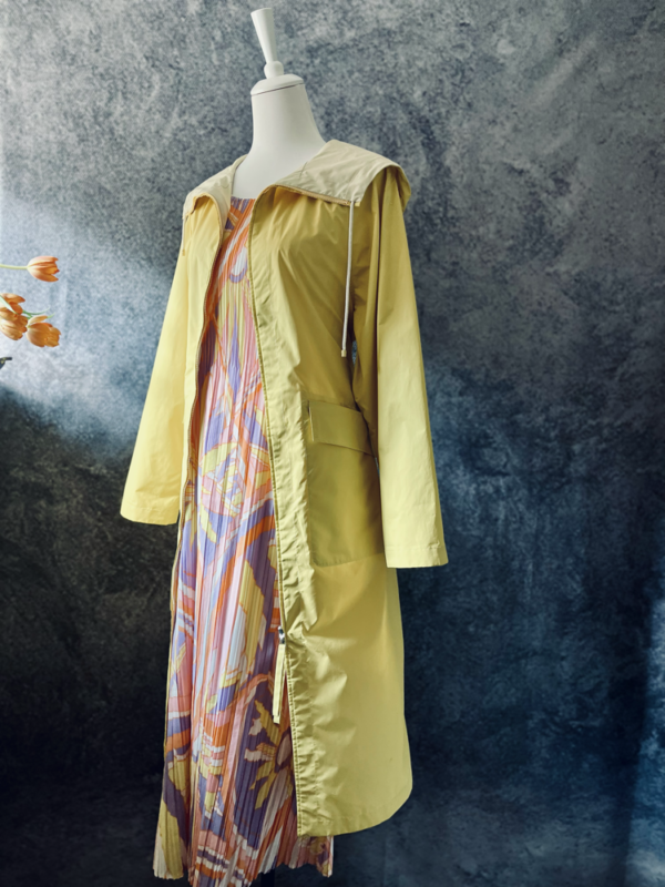 Schönster gelber Regenmantel von Annette Görtz aus feinem, federleichtem Material – ideal für stilvollen Wetterschutz. Der leichte Mantel überzeugt mit langen Ärmeln, praktischer Kapuze, großen seitlichen Taschen und einem Bindegürtel für eine feminine Silhouette. Innen in hellgelb-cremefarben gehalten, sorgt er für einen weichen Kontrast. Der durchgehende Reißverschluss vorne rundet das moderne Design funktional ab.