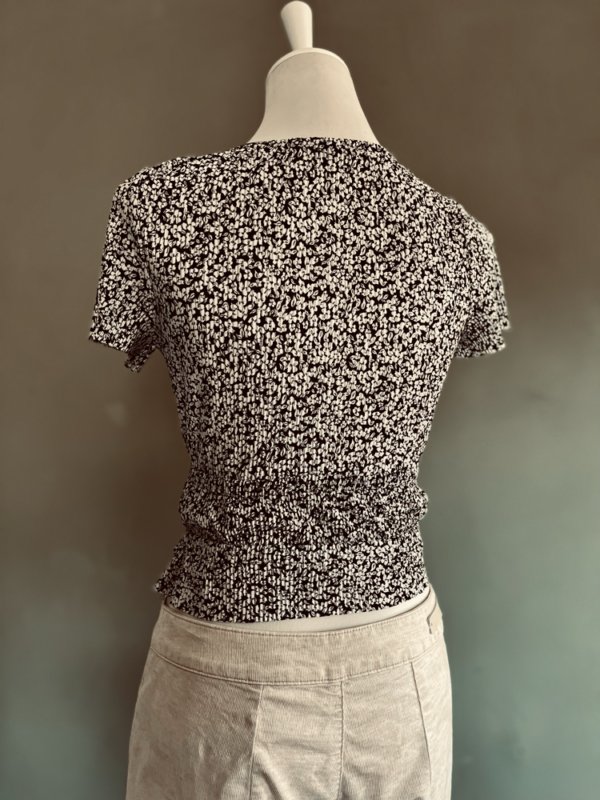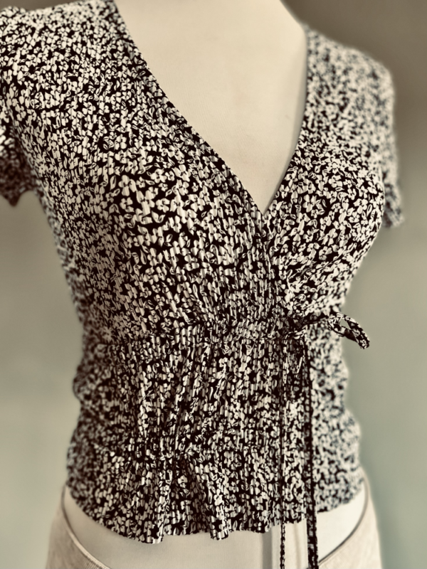 Der raffende Gummizug in der Taille formt eine schmeichelhafte Silhouette und wird mit einer hübschen Schleife stilvoll akzentuiert. Die kurze Länge macht die Bluse zum perfekten Begleiter für lässige Looks – ob zu High-Waist-Jeans oder luftigen Röcken.