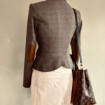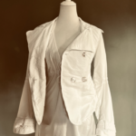 Der schmale, taillierte Schnitt und die dezent eingearbeiteten Schulterpolster sorgen für eine perfekte, formschöne Silhouette. Besonders liebevoll gestaltet: die vorne drapierten Taschen, die dem Look eine weiche, verspielte Note verleihen. Einsätze aus weißer Spitze setzen romantische Akzente und machen die Jacke zu einem einzigartigen Fashion-Statement.
