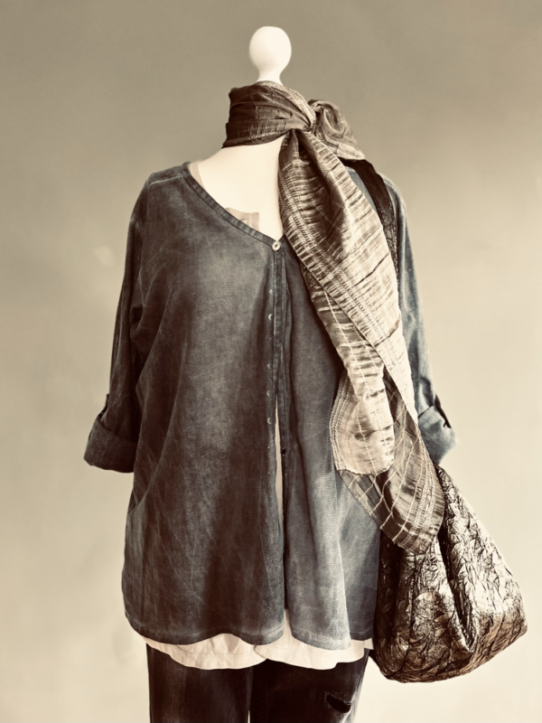 Die verstellbaren Ärmel bieten Flexibilität im Styling, während ein Perlmuttknopf und zwei dezente Druckknöpfe vorne für besondere Akzente sorgen. Das leichte, durchscheinende Material eignet sich perfekt für kreative Lagenlooks.