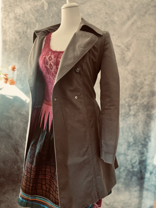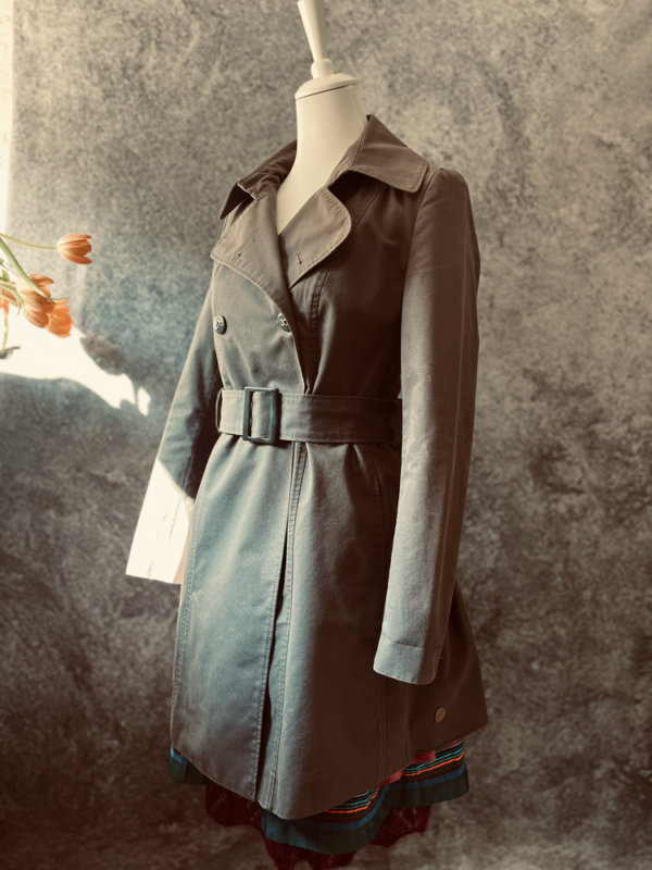 Der wunderschöne Trenchcoat von Hugo Boss in elegantem Grau vereint klassischen Stil mit besonderen Details. Der taillierte Schnitt sorgt für eine feminine Silhouette, während der Bindegürtel die Figur zusätzlich betont.