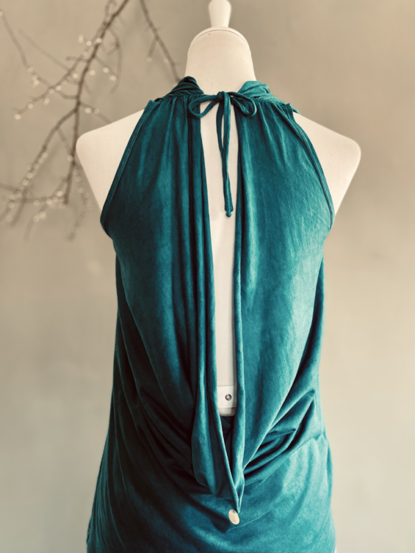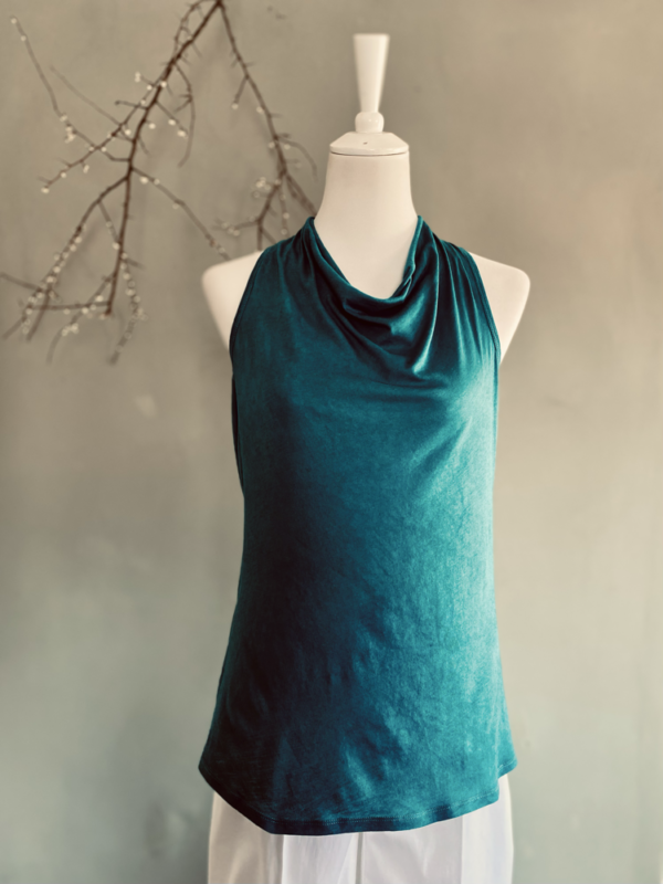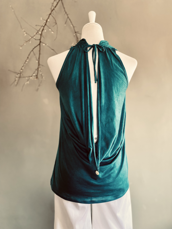 Der lange Wasserfallausschnitt am Rücken sorgt für einen überraschenden Hingucker und verleiht dem Look eine sinnliche Note. Im Nacken wird das Top locker geknotet. Ein zarter Perlmuttknopf setzt am Rücken einen eleganten Akzent.