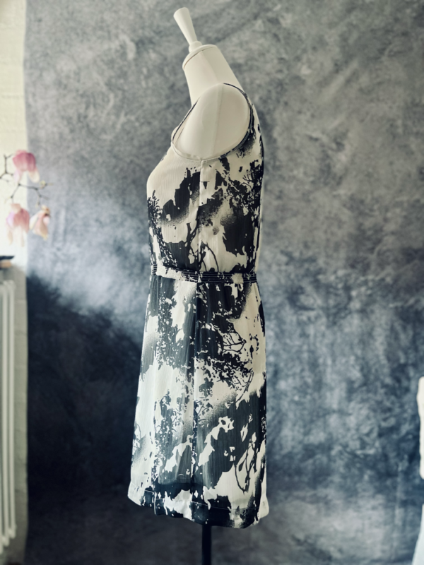 Das Seidenkleid von ESPRIT überzeugt mit einem modernen schwarz-weißen, abstrakten Print. Ein integriertes Unterkleid sorgt für angenehmen Tragekomfort, während der Gummizug in der Taille eine feminine Silhouette zaubert. Leicht, fließend und stilvoll – perfekt für viele Anlässe.