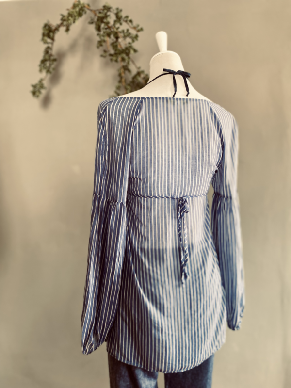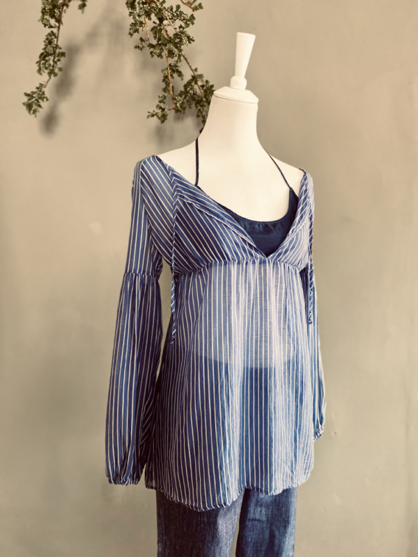 Diese zarte Bluse von Bailly Diehl besticht durch ihre feine Materialwahl und ihre aparte Ausstrahlung. Aus leicht transparenter, blau-weiß gestreifter Baumwolle gefertigt, wirkt sie luftig und raffiniert zugleich. Ein besonderes Detail ist das eingenähte, dunkelblaue Top, das im Nacken gebunden wird – ein subtiler Kontrast, der dem Look Tiefe und Eleganz verleiht.