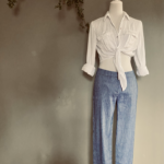 Die langen Ärmel, die im unteren Teil sanft gepufft sind, fügen eine romantische Note hinzu, während der leicht ausgestellte Schnitt der Bluse eine fließende, feminine Silhouette schafft.