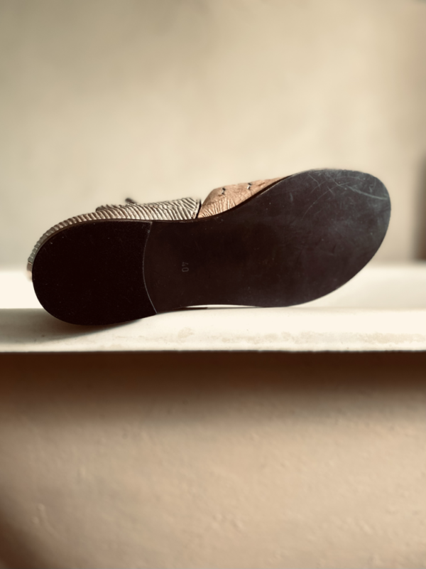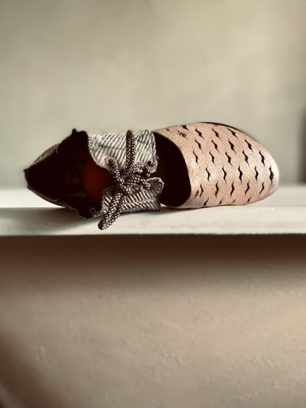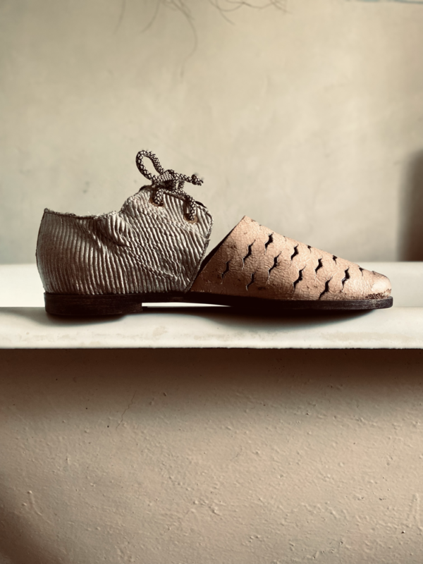 Diese besonderen Sandalen von Papucei verbinden kreative Raffinesse mit femininer Leichtigkeit. Die geschlossene Front aus durchbrochenem Leder in zartem Rosa mit feinem Silberschimmer wirkt luftig und edel zugleich – ein echter Blickfang mit subtiler Eleganz.