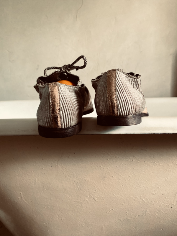 Der Fersenbereich aus silbernem Leder in Stoffoptik setzt einen spannenden Materialkontrast und rundet das ausgefallene Design kunstvoll ab. Ein flacher Absatz sorgt dabei für angenehmen Tragekomfort im Alltag.