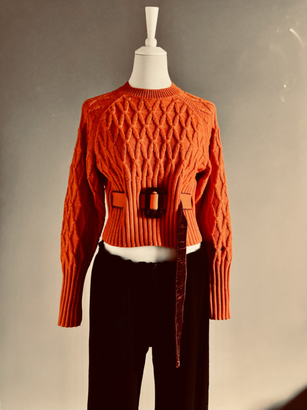 Der leuchtend orange-rote Zopfstrickpullover von Victoria Beckham ist ein ausdrucksstarkes Statement-Piece mit edlem Charakter. Die aufwendige Strickstruktur verleiht dem Modell Tiefe und Textur, während der taillierte Schnitt die feminine Silhouette elegant betont. Ein passender Gürtel mit großer Schnalle und feinen lilafarbenen Ziernähten setzt einen raffinierten Kontrast und rundet das Design perfekt ab. Ein luxuriöser Pullover, der Wärme, Stil und moderne Eleganz gekonnt vereint.
